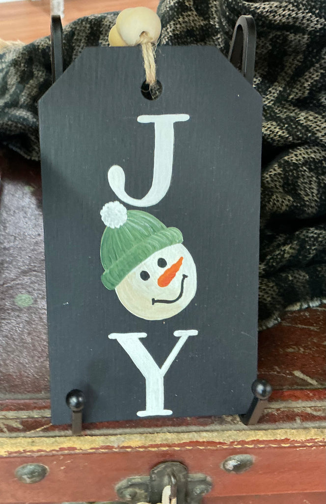 This wood tag measures 6” x 3.5” with extra length with the beaded twine hanger. This tag features a black background with hand lettered wording and hand painted snowflakes. Order processing time is 2 weeks.